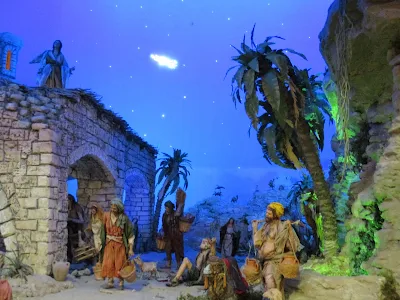 [...] L'ambientazione della Natività realizzata quest'anno riprende gli scenari del deserto della Tunisia con l'aggiunta di elementi di grande impatto significativo come la torre di Sion, il lago di Tiberiade e la cascata di un'oasi [...]